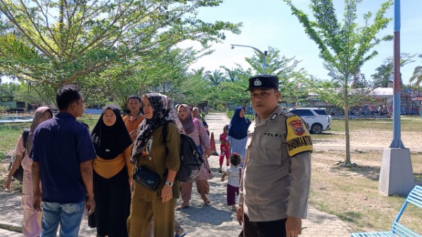 Bhabinkamtibmas Polsek Barumun Bripka Zulkifli Hasibuan saat melakukan sambang ke lokasi wisata Water Park Sisunggul Lungun, Minggu (06/07/2025). And.