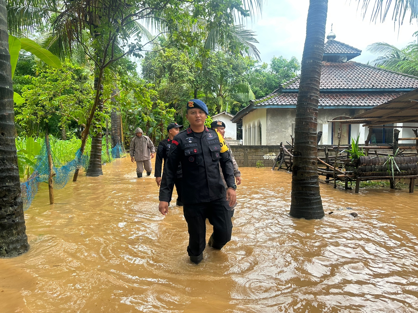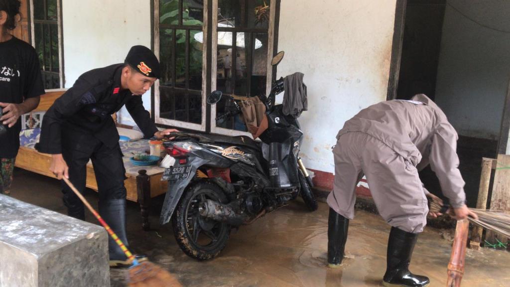 Pasukan Brimob turun langsung membantu membersihkan material yang terbawa air hujan seperti sampah, tanah lumpur dan puing-puing kayu yang berserakan di masjid, gang-gang dan rumah warga.