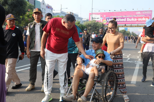 Wali Kota Bekasi, Tri Adhianto didampingi istri, Wiwiek Hargono turun memantau kegiatan hari bebas kendaraan tersebut.