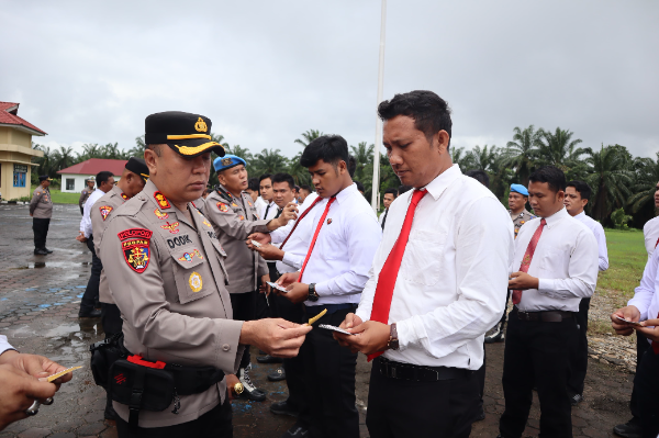 Kapolres AKBP Dodik Yuliyanto S.IK saat memeriksa kerapian dan kelengkapan personil pada apel pagi perdana di Lapangan Kapolres Palas, Senin (07/04/2025) / And