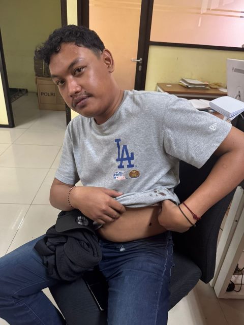 Joko salah seorang korban penusukan sedang memperlihatkan luka tusuknya.