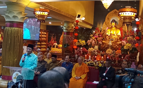Menteri Agama Nasaruddin Umar, tiba di wihara pukul 09.24 Dengan Mengenakan batik biru muda, celana hitam, serta peci hitam, Menag hadir dan disambut meriah umat Buddha di Wihara Ekayana Arama.
