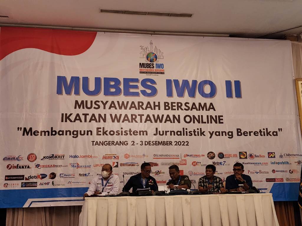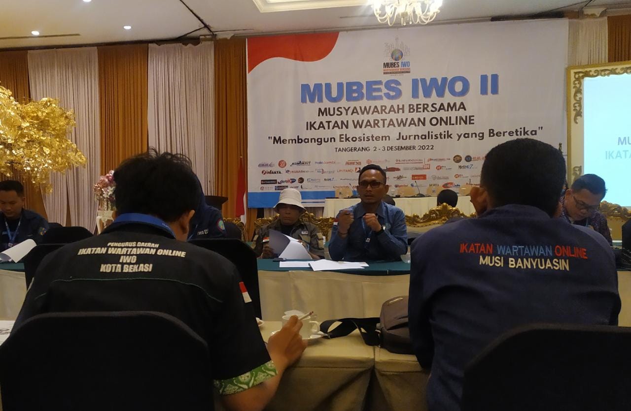 Seputarpublik, Tangerang – Pengurus Pusat Ikatan Wartawan Online (PP IWO) menggelar Musyawarah Bersama (Mubes) ke-2 untuk memilih Ketua Umum PP IWO Masa Bhakti 2022-2027 bertempat di Ballroom Hotel Istana Nelayan, Tangerang, Banten, Jumat dan Sabtu tanggal 2 dan 3 Desember 2022.