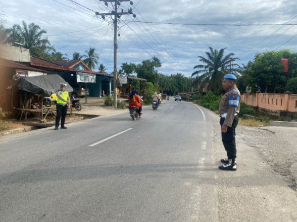 Seputar Publik, Palas - Polsek Barteng melalui Kapos Lantas menggelar pengamanan dan pengaturan lalu lintas (Gatur Lalin) Pam Padat pagi dan menegur pengendara Sepeda motor yang tidak memakai Helm SNI, di Simpang 3 SDN 0201 Desa Pasar Binanga, Kecamatan Barteng, Kabupaten Palas. Rabu. (16/04/2025)