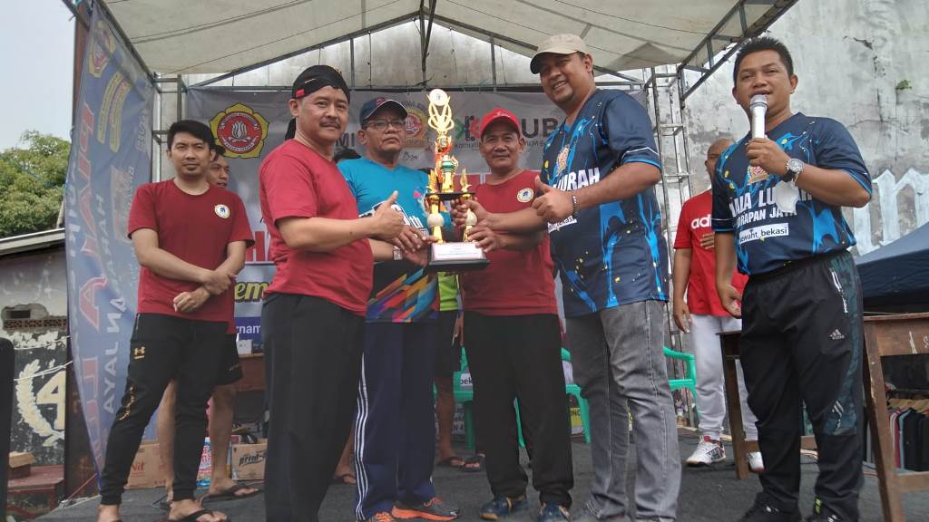 Lurah Harapan Jaya Mohammad Sholeh, ST turun langsung menyerahkan piala ke juara pertama Tim Bulu Tangkis RW 23 yang diterima oleh Ketua RW nya Ustadz H. Qomarudin, SE.