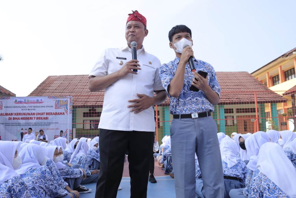 Seputarpublik, Kota Bekasi – Pelaksana Tugas (PLT) Wali Kota Bekasi Tri Adhianto bersama Ketua FKUB Abdul Manan mensosialisasikan semangat toleransi umat beragama di SMAN 07 Kota Bekasi, Selasa (01/10/2022).