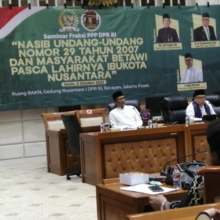 Seputarpublik, Jakarta – Fraksi Partai Persatuan Pembangunan (PPP) menerima aspirasi masyarakat Betawi mengenai pembentukan kelembagaan masyarakat adat Betawi. Hal itu disampaikan Wakil Ketua Komisi II DPR RI dari Fraksi PPP, Syamsurizal saat menjadi narasumber Seminar Fraksi bertajuk “Nasib Undang-undang Nomor 29 Tahun 2007 dan Masyarakat Betawi Pasca Lahirnya Ibukota Nusantara”. Senin (3/10/2022) di ruang BAKN, Gedung Nusantara l DPR RI, Senayan, Jakarta Pusat.