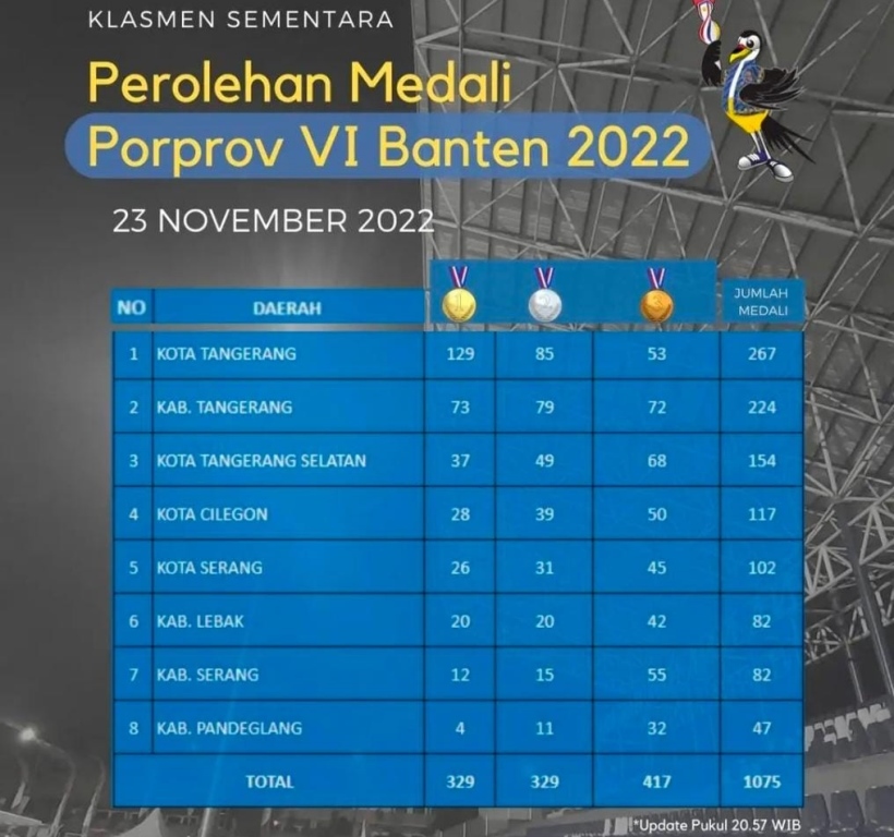 Kota Tangerang yang juga bertindak sebagai tuan rumah telah mengemas 129 Medali Emas hingga Kamis malam, 24 November 2022.