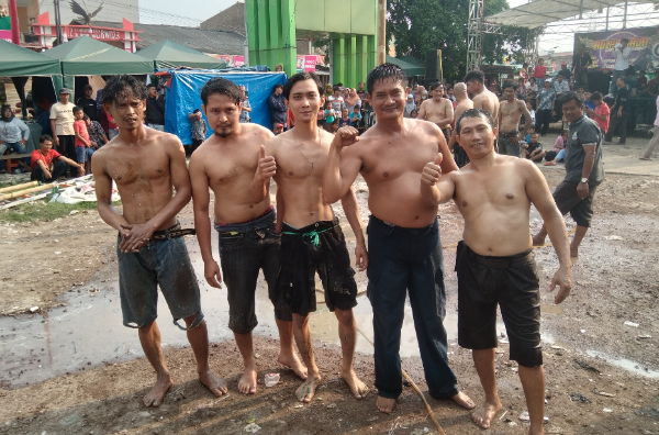 Kelompok Ujang pemenang lomba panjat pinang di pasar Harapan Jaya dalam rangka memeriahkan HUT RI Ke-80