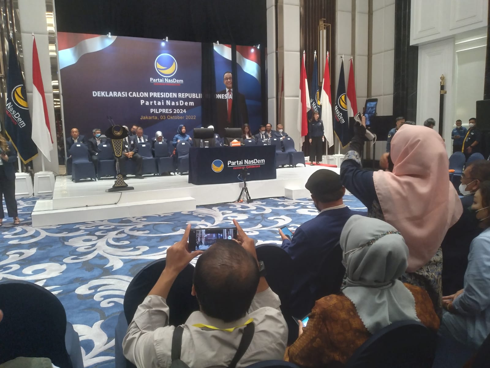 Ketua Umum DPP Partai NasDem Surya Paloh mengumumkan secara langsung nama capres itu di Ballroom NasDem Tower, Jakarta, Senin (3/10/2022).
