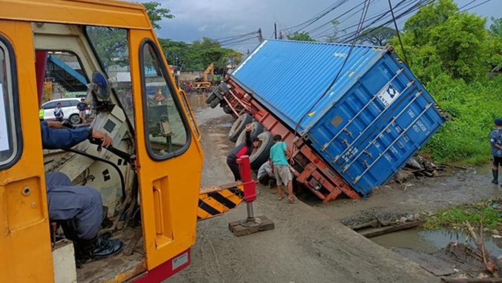 Seputarpublik, Tangerang – Sebuah truk kontainer yang bermuatan besi tiang listrik terguling di Jalan Raya Prancis, Dadap, Kabupaten Tangerang, Sabtu (12/11/2022).